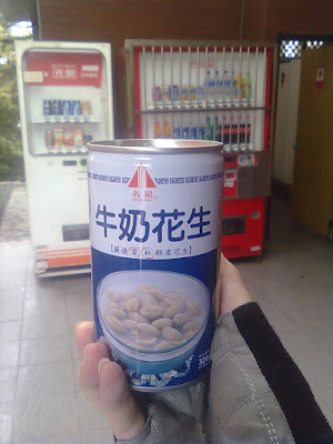 二話不說零錢兩枚掏出來,跟自動販買機買了這一罐“熱的”牛奶花生。趁熱吃下去好暖暖身子跟肚子啊。