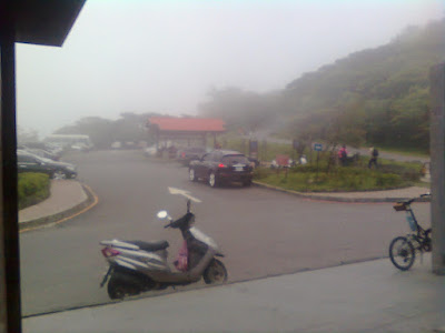 在廁所這邊內凹的地方躲風,順便吃牛奶花生,也順便拍拍外面停車場有多少車來到這,而遊客則在大霧裡往更高的地方走去。