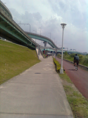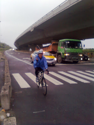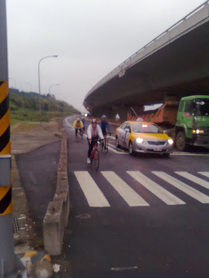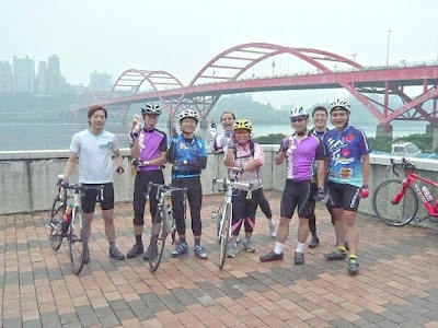 而騎回程的時侯,在某個路口的高架天橋下大伙因為熱身夠了,開始把風衣換下。而我則比其他人先換完,所以比較早一點點上路,所以變成帶頭騎的。然後也沒仔細看路的,結果在某個路口走錯路了,就給他騎進觀音工業區了耶!後頭還跟了2位同行的車友說...真是非常SORRY!害兩位跟我一起走錯路了。