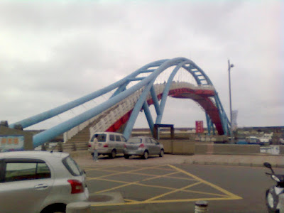 而在廣場外有一座橋,在橋上可以一覽漁港及周邊海岸風景。只可惜今天天氣陰陰的,海像不是很好,風浪都蠻大的,沙灘也沒下去,所以海邊風景看起來不是很優啊!
